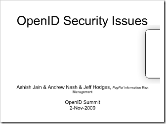 Presentation by Ashish Jain, Andrew Nash and Jeff Hodges of PayPal Information Risk Management at OpenID Summit, 2 November 2009.