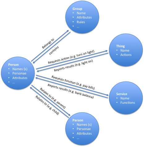 The relationships (edges) are primarily verbs that describe what actions the relationship supports. Â A primary role of identity management systems is to establish these relationships between people identities and service or thing identities in such a way that valuable actions can be performed.