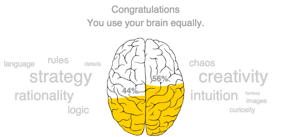 I took the short Sommer + Sommer brain test and found that I use both sides of my brain almost equally.  That was a bit surprising to me.  I expected that I’d be more predominantly logical. 🙂