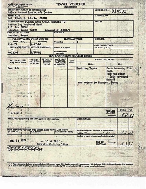 Col. Buzz Aldrin submitted an expense report requesting reimbursement for $33.31 to cover personal expenses for his Apollo 11 trip to the moon!
