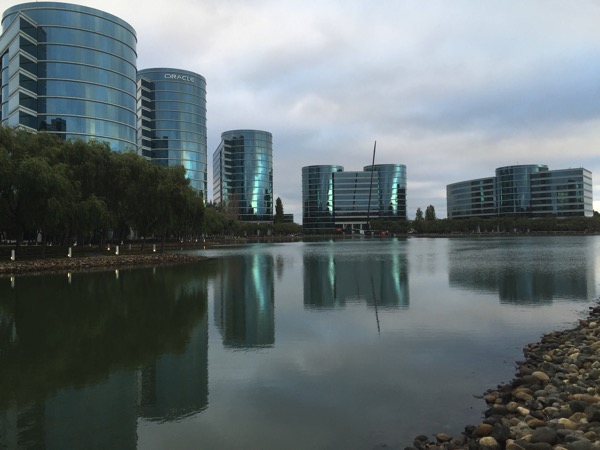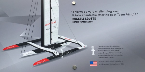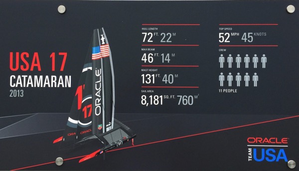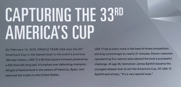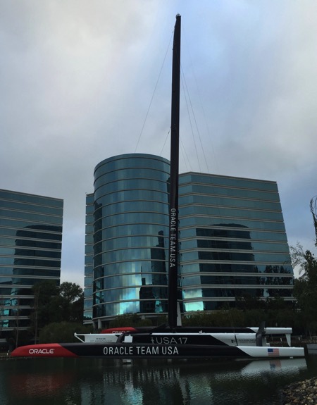 This morning, I arrived early at Oracle headquarters and took a stroll around the lake.  It was fun to see the 2010 America’s Cup winning yacht displayed in front of Building 500. Here are a few of the photos I took – of the yacht and descriptive information posted about the yacht and race.