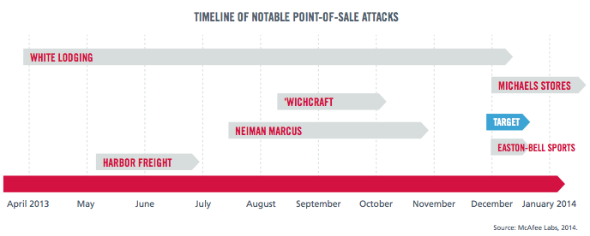 This morning, I read the recently-released McAfee Labs Threats Report – Fourth Quarter 2013  The lead story was entitled “The cybercrime industry and its role in POS attacks.”  To introduce a timeline chart that includes successful attacks on well known retailers, the report states: