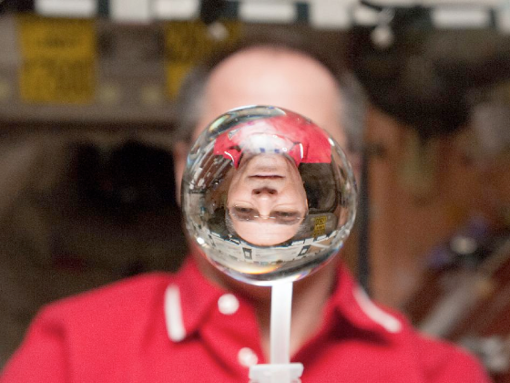 NASA astronaut Kevin Ford, Expedition 34 commander, watches a water bubble float freely between him and the camera, showing his image refracted, in the Unity node of the International Space Station.
